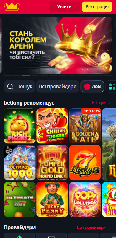 Офіційний сайт Betking казино - betking-casino.com.ua для українських гравців пропонує сучасний, стильний і зручний інтерфейс у темній гамі з яскравими червоними та жовтими акцентами. Оформлення відповідає потребам сучасного гравця, дозволяючи швидко знаходити потрібну інформацію та послуги. Головна сторінка привертає увагу динамічними банерами з актуальними акціями і бонусами, спрощуючи вибір найцікавіших пропозицій. Зручна структура меню та інтерактивні елементи роблять навігацію інтуїтивною і простою. Сайт добре оптимізовано для мобільних пристроїв, що дозволяє насолоджуватися іграми в будь-якому місці без втрати якості та швидкості.